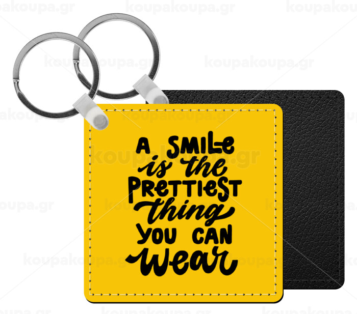 A smile is the prettiest thing you can wear, Μπρελόκ Δερματίνη, τετράγωνο ΜΑΥΡΟ (5x5cm)