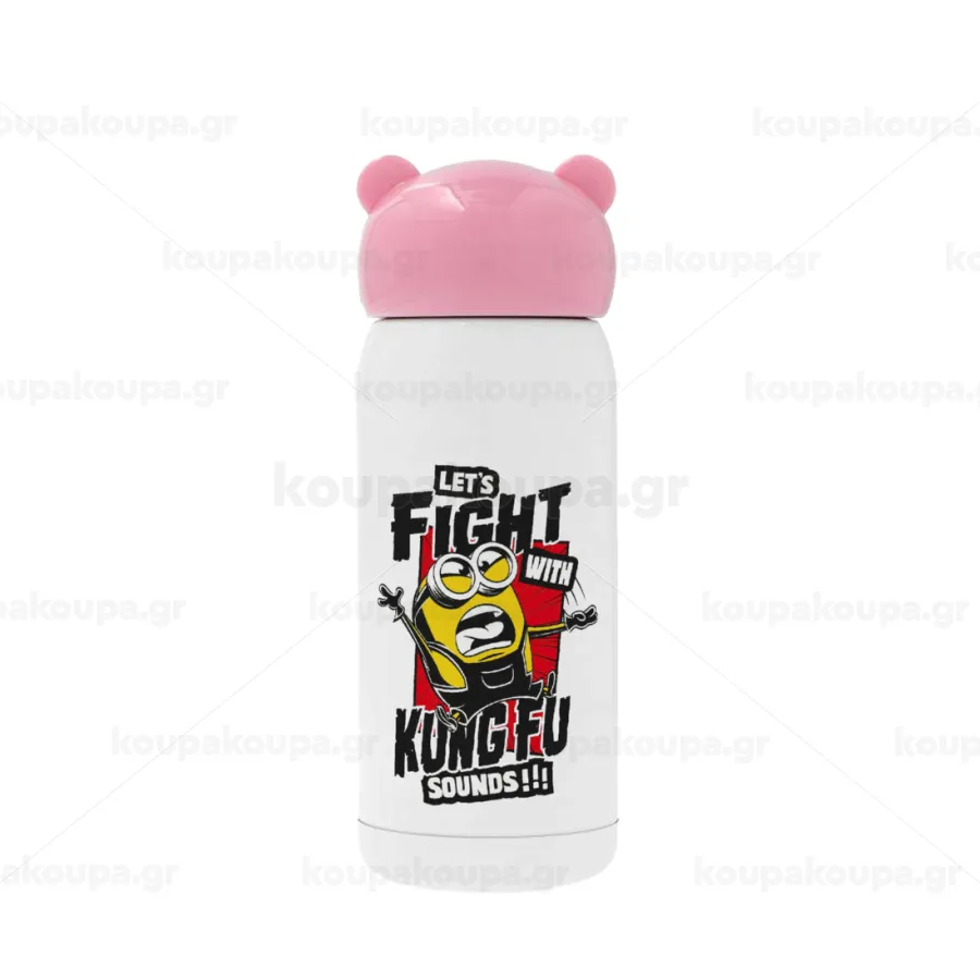 Minions Let's fight with kung fu sounds, Pink stainless steel thermal flask, 320ml