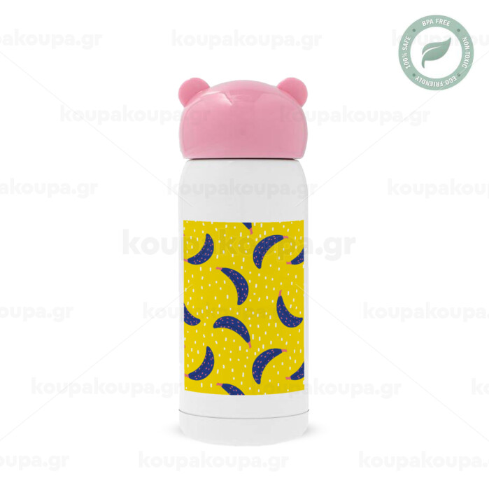 Yellow seamless with blue bananas, Pink stainless steel thermal flask, 320ml