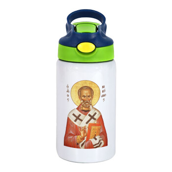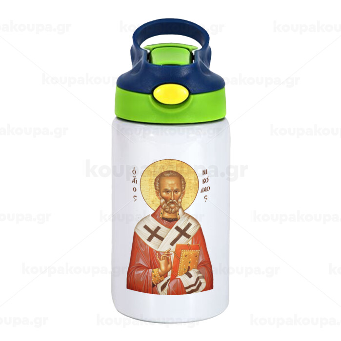 Saint Nicholas orthodox , Children's hot water bottle, stainless steel, with safety straw, green, blue (350ml)