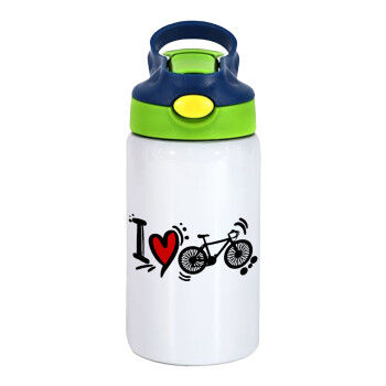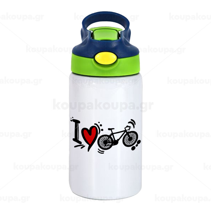 I love my bike, Children's hot water bottle, stainless steel, with safety straw, green, blue (350ml)