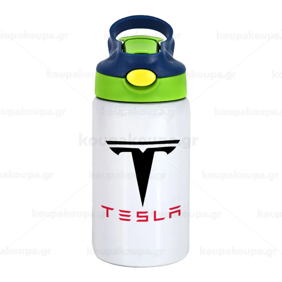 Tesla motors, Children's hot water bottle, stainless steel, with safety straw, green, blue (350ml)