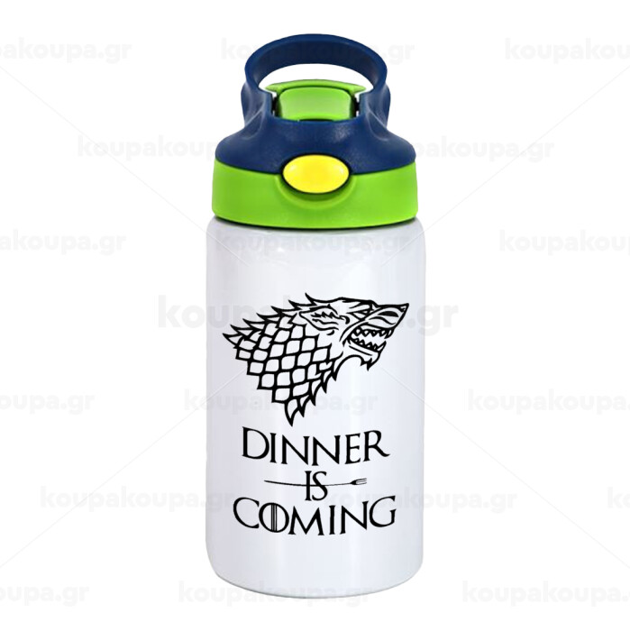 Dinner is coming (GOT), Children's hot water bottle, stainless steel, with safety straw, green, blue (350ml)