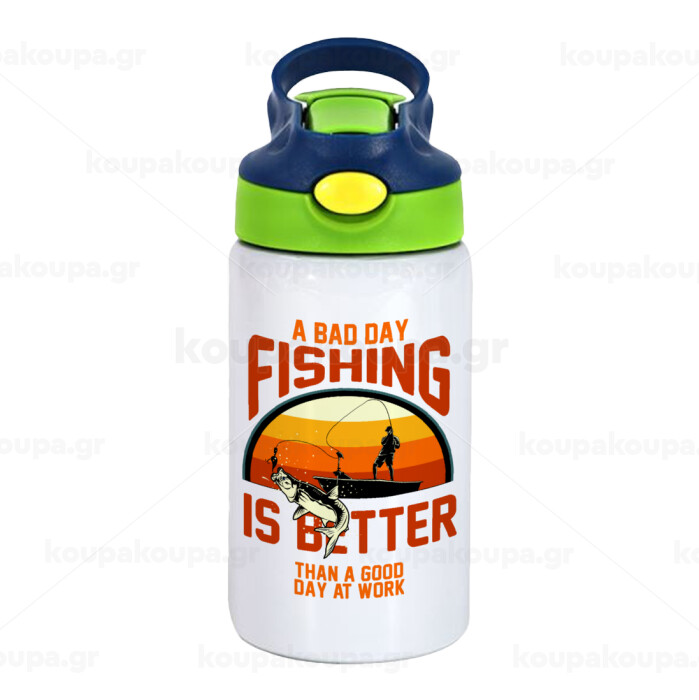 A bad day FISHING is better than a good day at work, Children's hot water bottle, stainless steel, with safety straw, green, blue (350ml)
