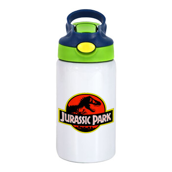 Jurassic park, Children's hot water bottle, stainless steel, with safety straw, green, blue (350ml)