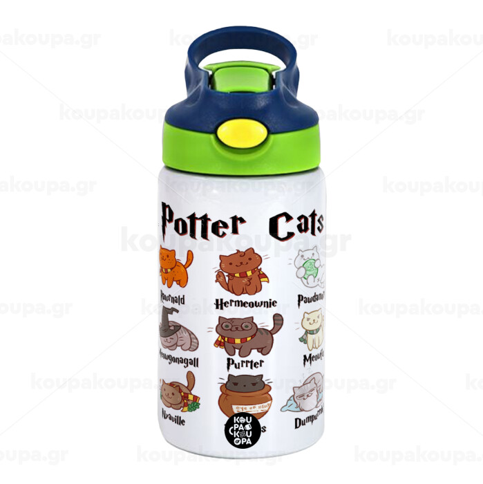 Potter Cats, Children's hot water bottle, stainless steel, with safety straw, green, blue (350ml)