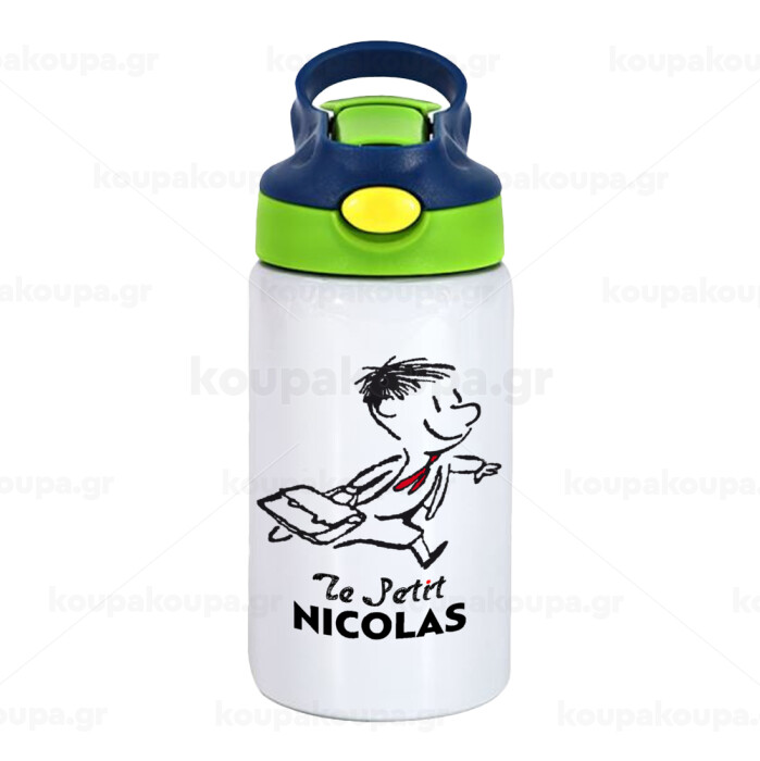 Le Petit Nicolas, Children's hot water bottle, stainless steel, with safety straw, green, blue (350ml)