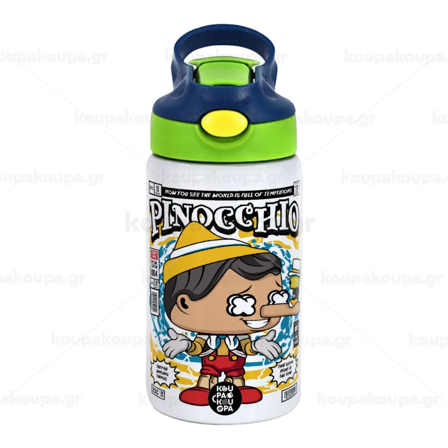 Pinocchio, Children's hot water bottle, stainless steel, with safety straw, green, blue (350ml)