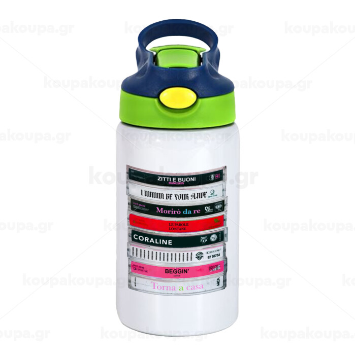 Maneskin Cassette, Children's hot water bottle, stainless steel, with safety straw, green, blue (350ml)