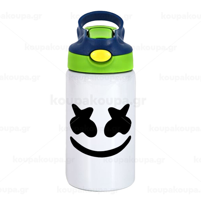 Marshmello, Children's hot water bottle, stainless steel, with safety straw, green, blue (350ml)