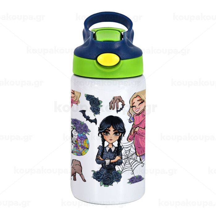 Wednesday and Enid Sinclair, Children's hot water bottle, stainless steel, with safety straw, green, blue (350ml)
