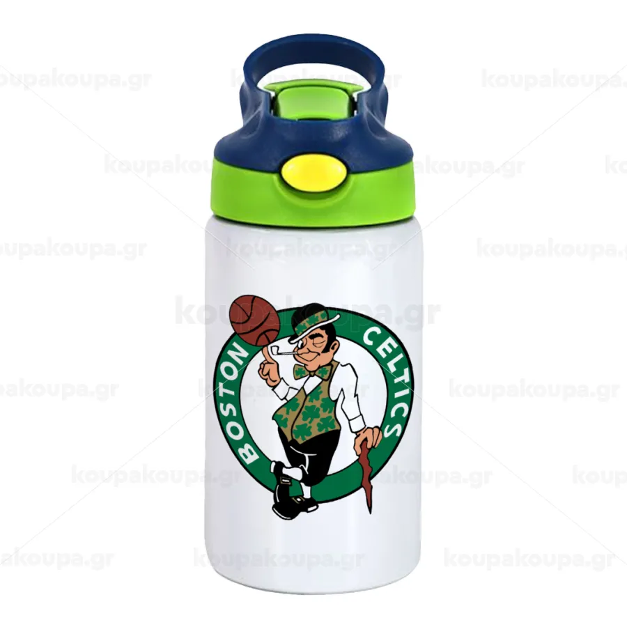 Boston Celtics, Children's hot water bottle, stainless steel, with safety straw, green, blue (350ml)