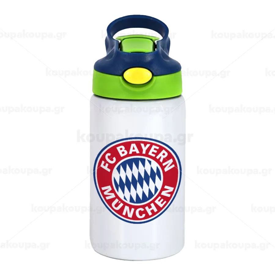 FC Bayern Munich, Children's hot water bottle, stainless steel, with safety straw, green, blue (350ml)