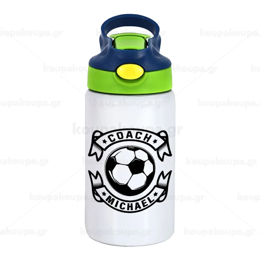 Soccer coach, Children's hot water bottle, stainless steel, with safety straw, green, blue (350ml)