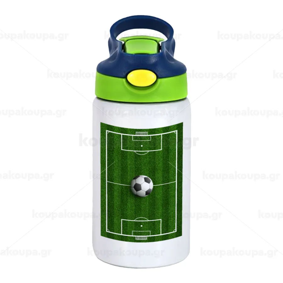 Soccer field, Γήπεδο ποδοσφαίρου, Children's hot water bottle, stainless steel, with safety straw, green, blue (350ml)