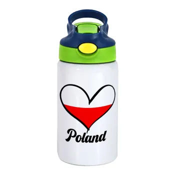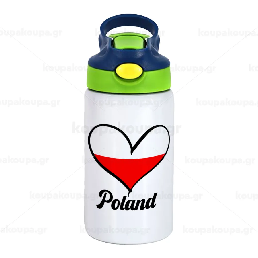 Poland flag, Children's hot water bottle, stainless steel, with safety straw, green, blue (350ml)