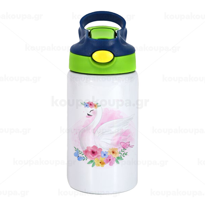 White swan, Children's hot water bottle, stainless steel, with safety straw, green, blue (350ml)