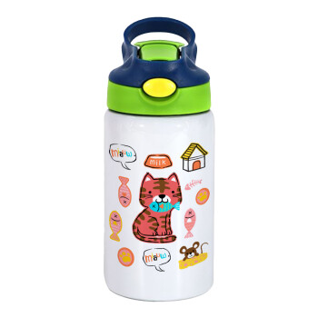 Cats and Fishes, Children's hot water bottle, stainless steel, with safety straw, green, blue (350ml)