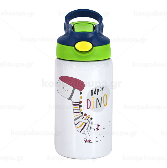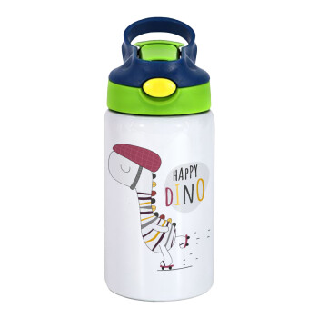 Happy Dino, Children's hot water bottle, stainless steel, with safety straw, green, blue (350ml)