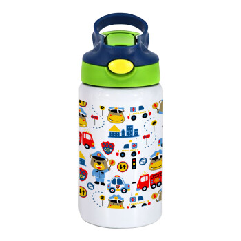 Rescue team cartoon, Children's hot water bottle, stainless steel, with safety straw, green, blue (350ml)