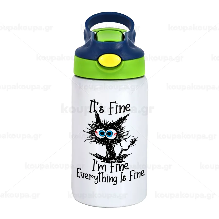 Cat, It's Fine I'm Fine Everything Is Fine, Children's hot water bottle, stainless steel, with safety straw, green, blue (350ml)