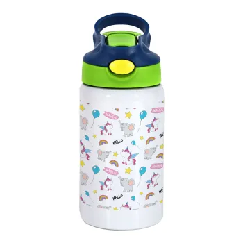 Happy Clouds Doodle, Children's hot water bottle, stainless steel, with safety straw, green, blue (350ml)
