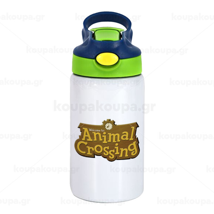 Animal Crossing, Children's hot water bottle, stainless steel, with safety straw, green, blue (350ml)