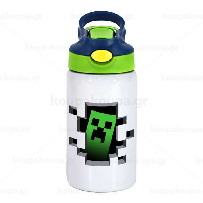 Minecraft creeper, Children's hot water bottle, stainless steel, with safety straw, green, blue (350ml)