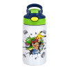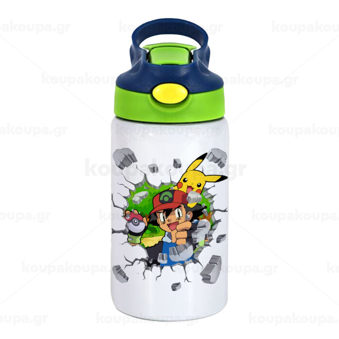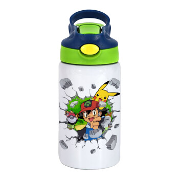 Pokemon brick, Children's hot water bottle, stainless steel, with safety straw, green, blue (350ml)