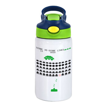Space invaders, Children's hot water bottle, stainless steel, with safety straw, green, blue (350ml)