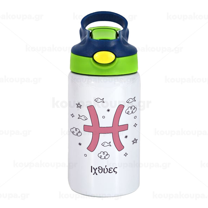 Ζώδια Ιχθύες, Children's hot water bottle, stainless steel, with safety straw, green, blue (350ml)