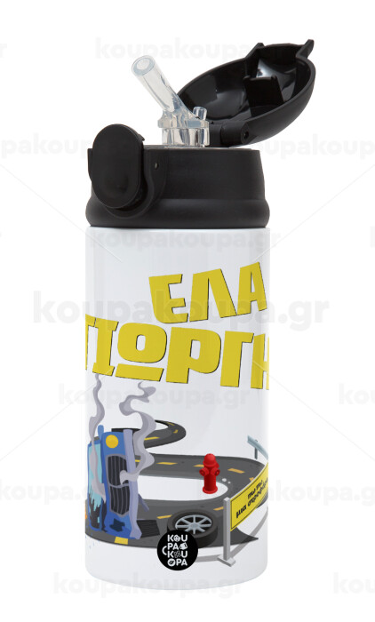 Έλα Γιώργη, πω πω μια στροφάρα, Children's hot water bottle, stainless steel, with safety straw, Black (360ml) BPA-FREE
