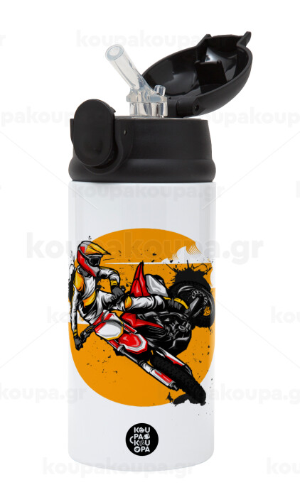 Motocross, Children's hot water bottle, stainless steel, with safety straw, Black (360ml) BPA-FREE