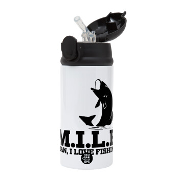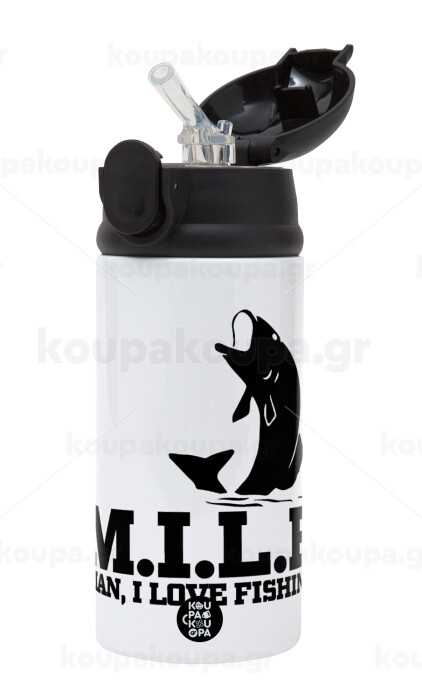 M.I.L.F. Mam i love fishing, Children's hot water bottle, stainless steel, with safety straw, Black (360ml) BPA-FREE