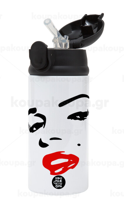 Marilyn Monroe, Children's hot water bottle, stainless steel, with safety straw, Black (360ml) BPA-FREE