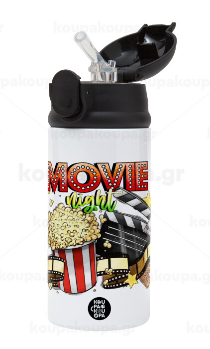 Movie night, Children's hot water bottle, stainless steel, with safety straw, Black (360ml) BPA-FREE