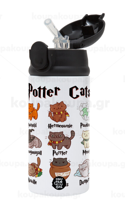 Potter Cats, Children's hot water bottle, stainless steel, with safety straw, Black (360ml) BPA-FREE