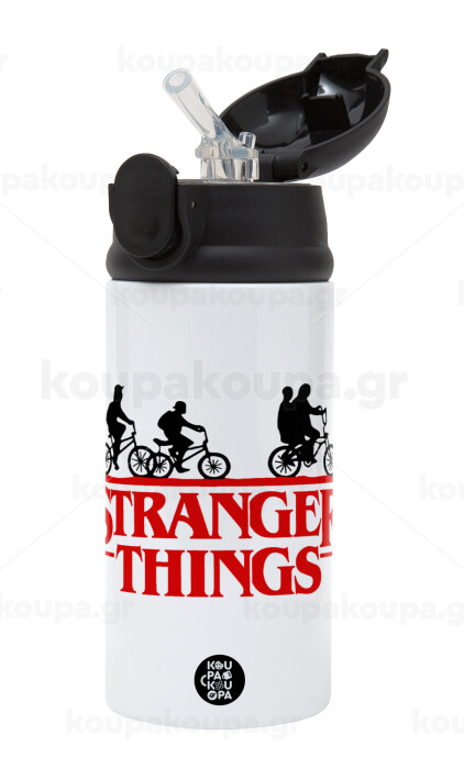 Stranger Things red, Children's hot water bottle, stainless steel, with safety straw, Black (360ml) BPA-FREE
