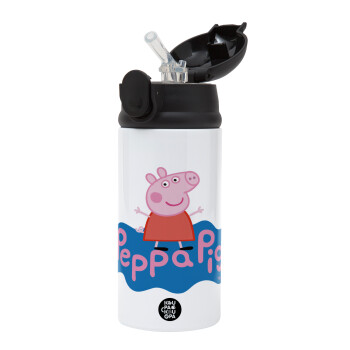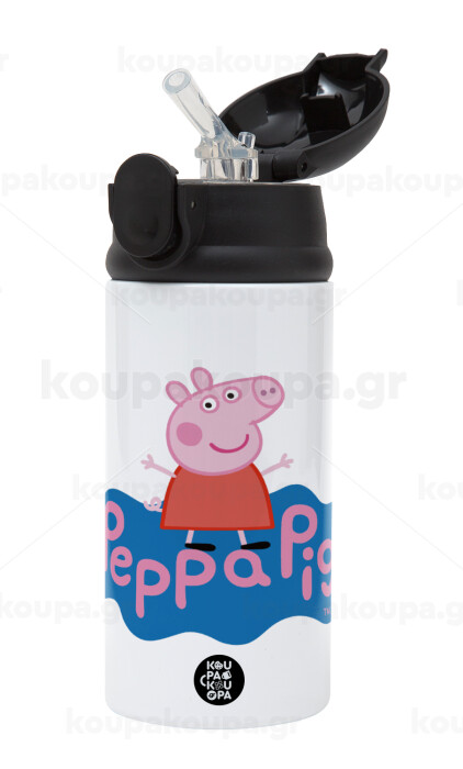 Πέππα το γουρουνάκι μπλε με όνομα, Children's hot water bottle, stainless steel, with safety straw, Black (360ml) BPA-FREE