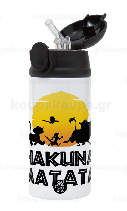 Hakuna Matata, Children's hot water bottle, stainless steel, with safety straw, Black (360ml) BPA-FREE