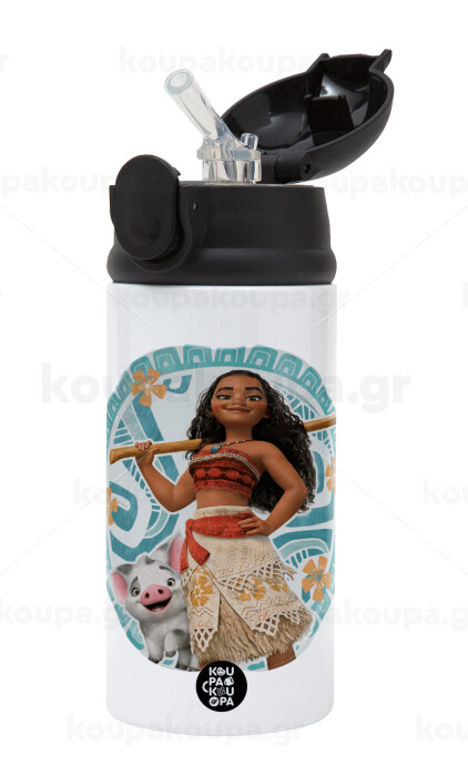 Moana, Children's hot water bottle, stainless steel, with safety straw, Black (360ml) BPA-FREE
