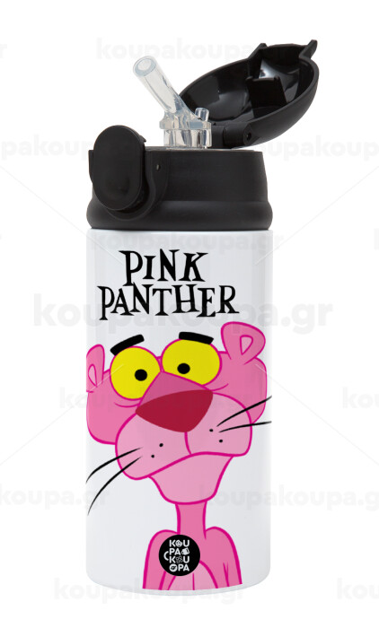 Pink Panther cartoon, Children's hot water bottle, stainless steel, with safety straw, Black (360ml) BPA-FREE