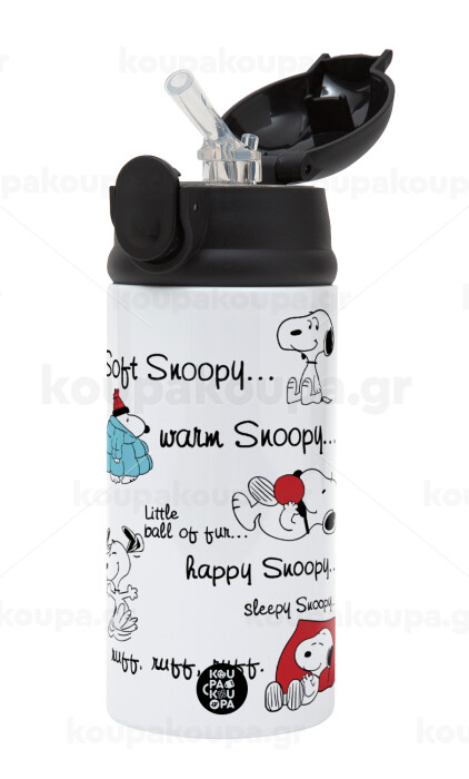 Snoopy manual, Children's hot water bottle, stainless steel, with safety straw, Black (360ml) BPA-FREE