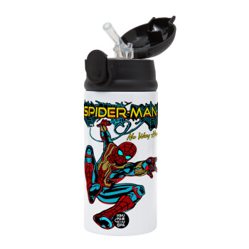 Spiderman no way home, Children's hot water bottle, stainless steel, with safety straw, Black (360ml) BPA-FREE