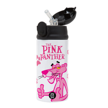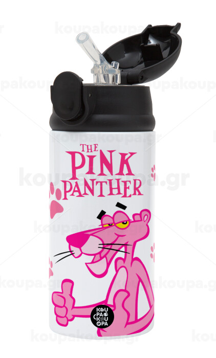The pink panther, Children's hot water bottle, stainless steel, with safety straw, Black (360ml) BPA-FREE