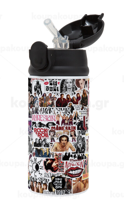 Maneskin stickers, Children's hot water bottle, stainless steel, with safety straw, Black (360ml) BPA-FREE