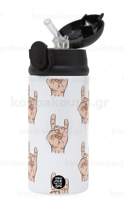 Rock hands, Children's hot water bottle, stainless steel, with safety straw, Black (360ml) BPA-FREE