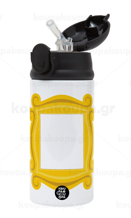 Friends frame, Children's hot water bottle, stainless steel, with safety straw, Black (360ml) BPA-FREE