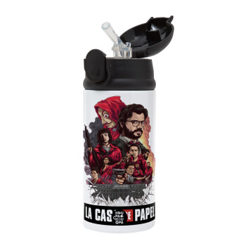 La casa de papel drawing cover, Children's hot water bottle, stainless steel, with safety straw, Black (360ml) BPA-FREE