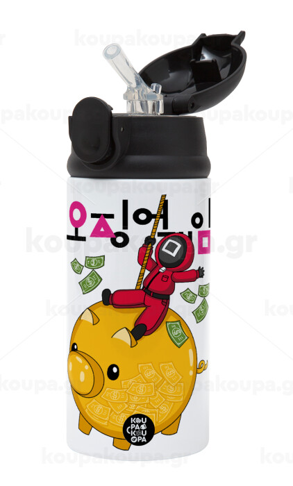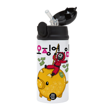 Squid game money pig, Children's hot water bottle, stainless steel, with safety straw, Black (360ml) BPA-FREE